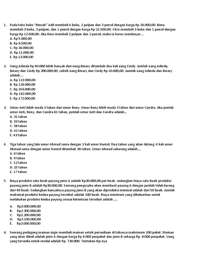 Biaya produksi satu buah payung jenis a adalah rp20.000,00 per buah, sedangkan biaya satu buah produksi payung jenis b adalah rp30.000,00.